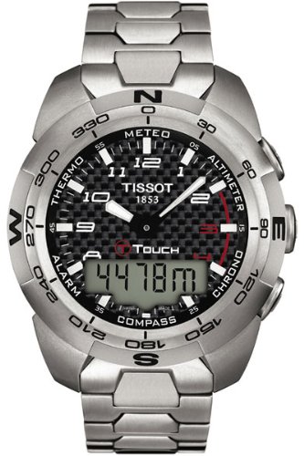 Satin Finish Titanium case and bracelet. Black Touch Screen dial. Bidirectional Rotating bezel. Scratch Resistant Sapphire crystal. Deployment clasp. Quartz movement. 43mm case diameter. Water resistant to 100m / 330ft. Perpetual Calendar, Luminous hands, LCD backlight, 2nd time zone, Barometer, Altimeter, Compass, Chronograph, Thermometer. Tissot T-Touch Expert Titanium Analog/Digital Mens Watch T013.420.44.202.00.For the ultimate in high-quality materials paired with high-technology performance, the Tissot Men's T Touch Expert Watch is designed for a man who wants a watch that can do more than just tell time. The case and bracelet are made from titanium, with a smooth satin finish--it's lightweight and hypoallergenic. The textured black displays everything you'd want in an advanced, modern watch, and more. It displays white hands and defined Arabic numeral indexes along with a LCD backlight, digital display for alarm, chronograph, thermometer, barometer, and perpetual calendar functions. There an altimeter on the titanium bezel along with compass bearings on the outer perimeter. The Tissot Men's T Touch Expert Watch is packed with all the technology advancements that a sporty, active man desires and features a sapphire crystal for ultimate scratch resistance. Water resistant to 330 feet (100 meters), it's powered by Swiss-made quartz movement with a handy battery life indicator.